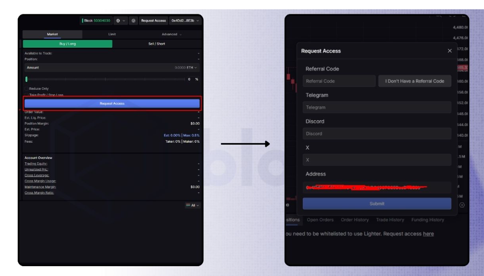 Bước 3: Chọn Request Access, điền các thông tin như Referral Code, Telegram, Discord và X để kích hoạt tài khoản. Nếu chưa có mã mời, bạn có thể tìm trong Discord của dự án.