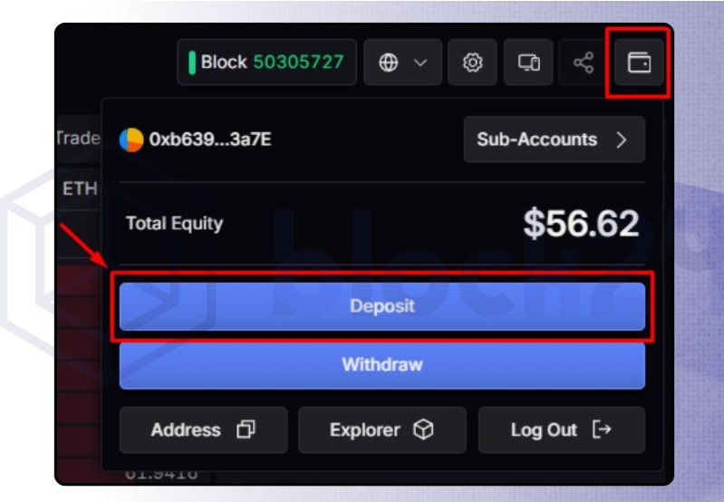 Bước 4: Bấm vào biểu tượng chiếc ví ở góc trên bên phải, chọn Deposit để bắt đầu nạp tiền USDC vào tài khoản.