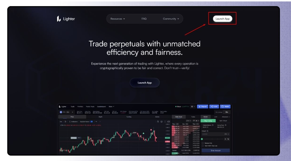 Bước 1: Truy cập https://lighter.xyz/ và bấm vào Launch App.